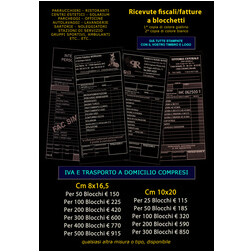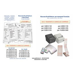 Ricevute fiscali di tutti i tipi, biglietti da visita, volantini, depliant, manifesti, locandine, carta intestata, buste da lettera, tovagliette personalizzate, blocchi comande, documenti di trasporto, fatture, brochure, menù, buoni consegna, buoni benzina, cartoline, inviti, segnalibro, gadget, calendari, penne, etichette adesive, schede notifica hotel, card, blocchetti ordinazioni, fascicoli, modulistica, grafiche, blok notes, blocchi carta chimica, flyers, cartellini con foro, creazione loghi aziendali, opuscoli, riviste, giornalini